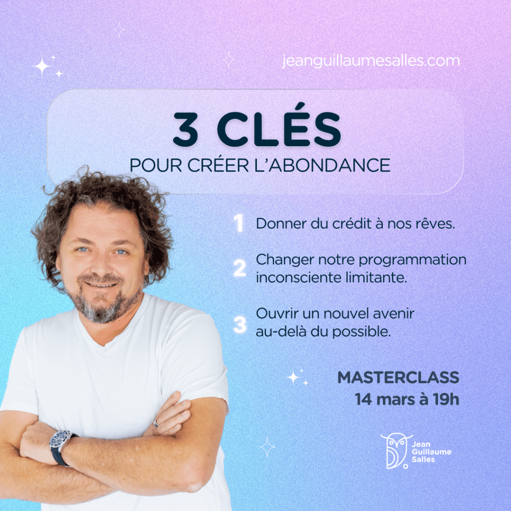 Forte de mon expérience personnelle et de plus de 20 ans en tant que thérapeute et formateur, je t’invite à cette Masterclass pour t’apprendre à générer suffisamment d’argent pour vivre la vie que tu désires.